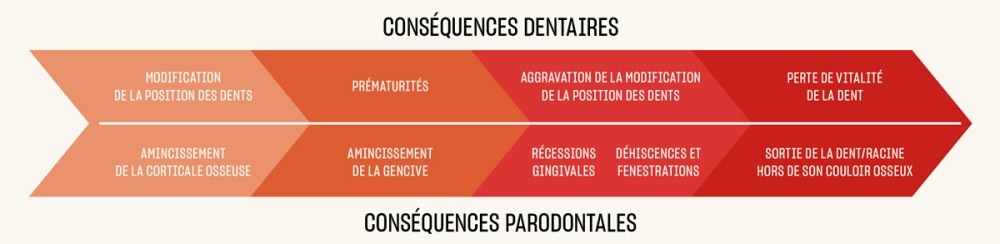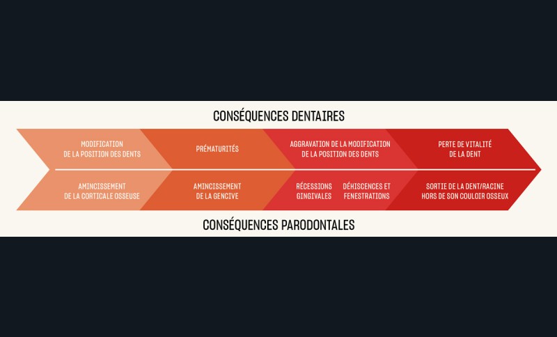 Ces mouvements peuvent également s’associer entre eux et une variété de manifestations cliniques peut alors s’observer. Les conséquences dentaires et parodontales du SF varient d’une problématique mineure (déplacement faible) jusqu’à l’exposition de la racine et de l’apex de la dent atteinte avec, à terme, perte de sa vitalité. Les facteurs de risque associés à l’apparition d’un SF ont été recherchés dans plusieurs études dont les résultats ne sont pas concordants, hormis la présence de parafonction de type onycophagie. Des hypothèses étiologiques ont également été évoquées comme étant liées au praticien (pose d’un fil de contention non passif, déformation du fil lors de la pose…) ou au fil de contention (déformation du fil, instabilité de ses propriétés mécaniques…) et des mesures préventives associées ont ainsi été proposées. Finalement, la complexité des traitements, souvent pluridisciplinaires, est proportionnelle à la sévérité des situations cliniques.