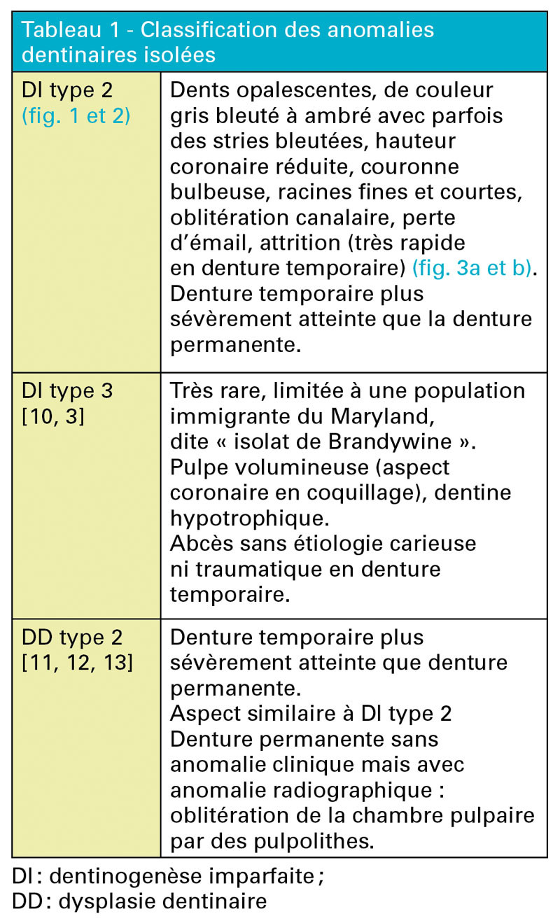 Shield [3] a proposé en 1973 une classification fondée sur des différences phénotypiques. Il distingue les anomalies dentinaires isolées des anomalies dentinaires syndromiques (tableaux 1 et 2).