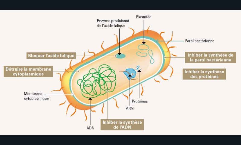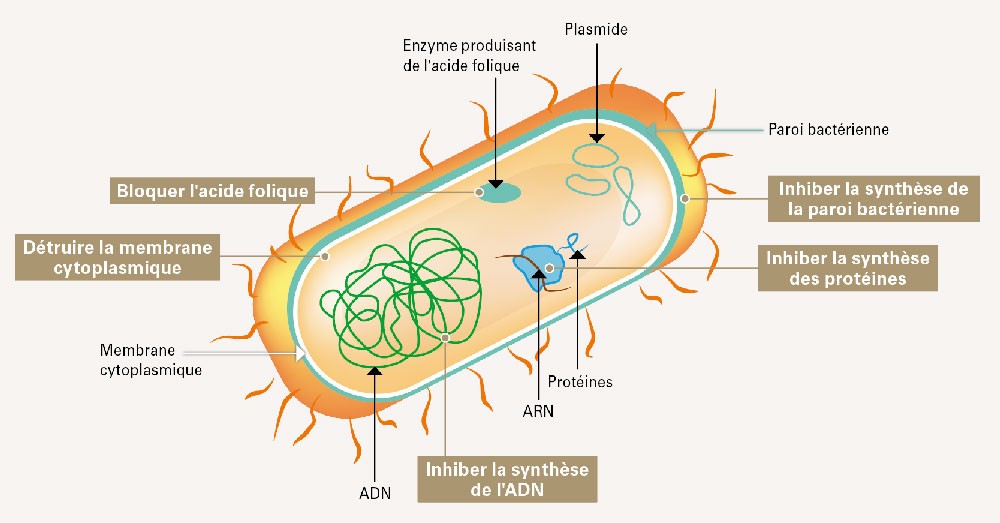 L’avènement des antibiotiques a constitué l’une des grandes révolutions médicales du XXe siècle. D’abord naturels, ils ont très vite été remplacés par une majorité de molécules de synthèse, dont l’objectif est d’avoir une activité antibactérienne, avec des caractéristiques pharmacocinétiques adaptées à l’utilisation souhaitée tout en ayant une toxicité minimale. L’antibiotique varie selon les bactéries ciblées, car elles ne sont pas toutes sensibles aux mêmes modes d’action des antibiotiques, et donc aux mêmes molécules [1]. Les principaux modes d’action des antibiotiques (inhibition de la synthèse de la paroi bactérienne, de la synthèse des protéines ou de l’ADN, destruction de la membrane cytoplasmique…) sont illustrés dans la figure 1 [2].