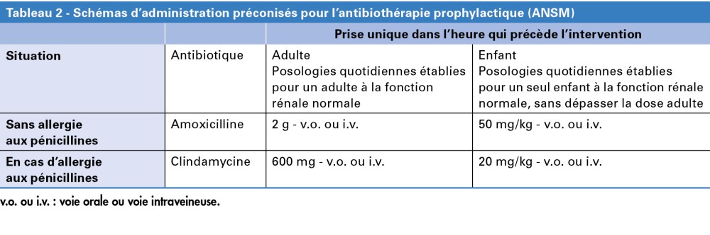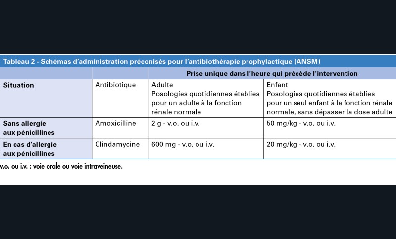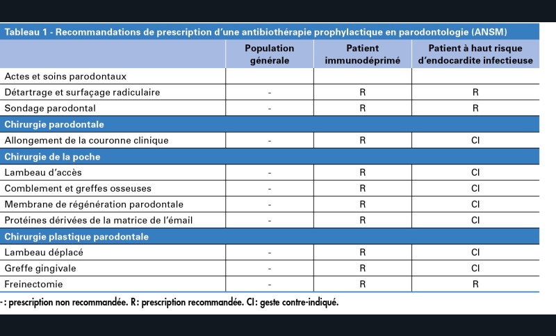 En parodontologie, la prescription d’une antibiothérapie prophylactique n’est pas recommandée pour la population générale pour les chirurgies et les soins parodontaux, même ceux ayant une implication osseuse (lambeau, élongation coronaire) (tableau 1).
