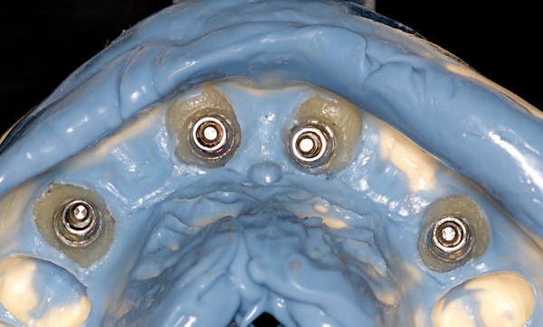Comme dans les secteurs postérieurs, l’objectif de l’empreinte est d’enregistrer la position de la ou des plateformes implantaires entre elles et leurs rapports avec les dents collatérales et antagonistes. On utilise toujours un porte-empreinte global pour enregistrer la totalité de l’arcade, ceci pour assurer un repositionnement optimal des modèles en occlusion. Comme indiqué dans la partie 1 de cette série, les matériaux de choix sont les élastomères, polyéther ou vinyl-polysiloxane, sans qu’aucune étude n’ait pu montrer une différence statistiquement significative entre ces deux familles de matériaux [6].