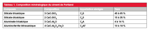 Leur composition peut être décrite soit en fonction des composés (silicate tricalcique, silicate dicalcique, aluminate tricalcique, aluminoferrite tétracalcique) (tableau 1), soit en fonction des oxydes (oxyde de calcium, silice, aluminium, magnésium…) constitutifs.