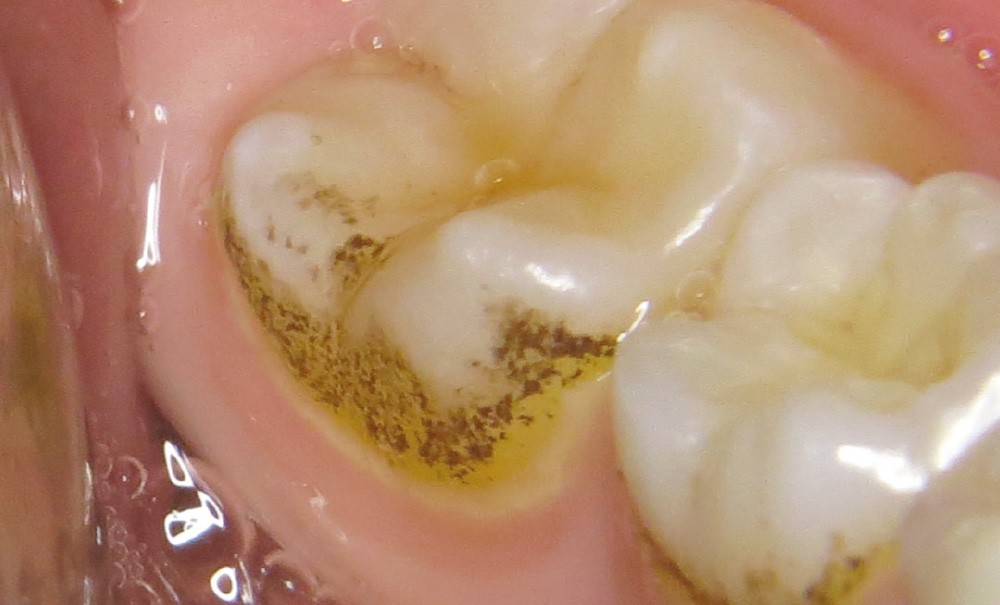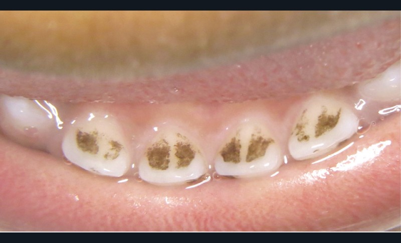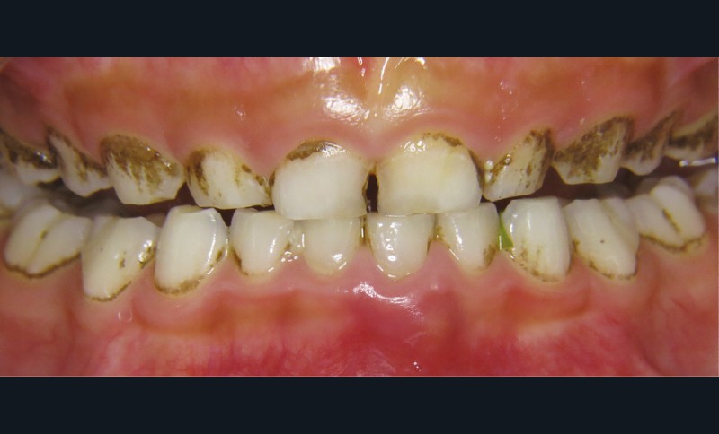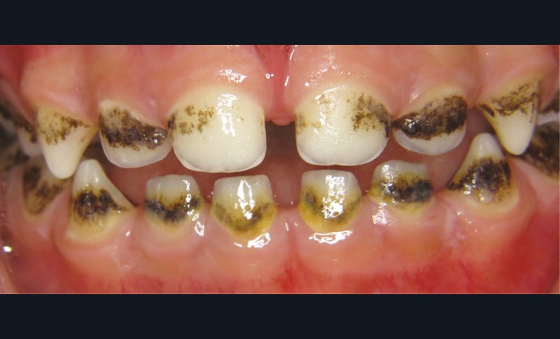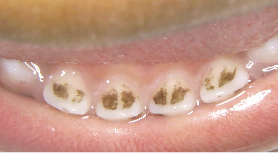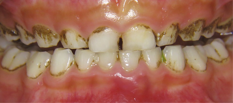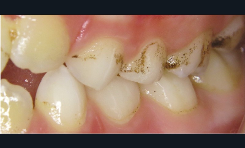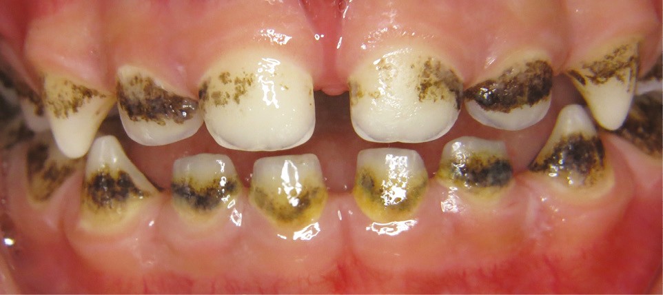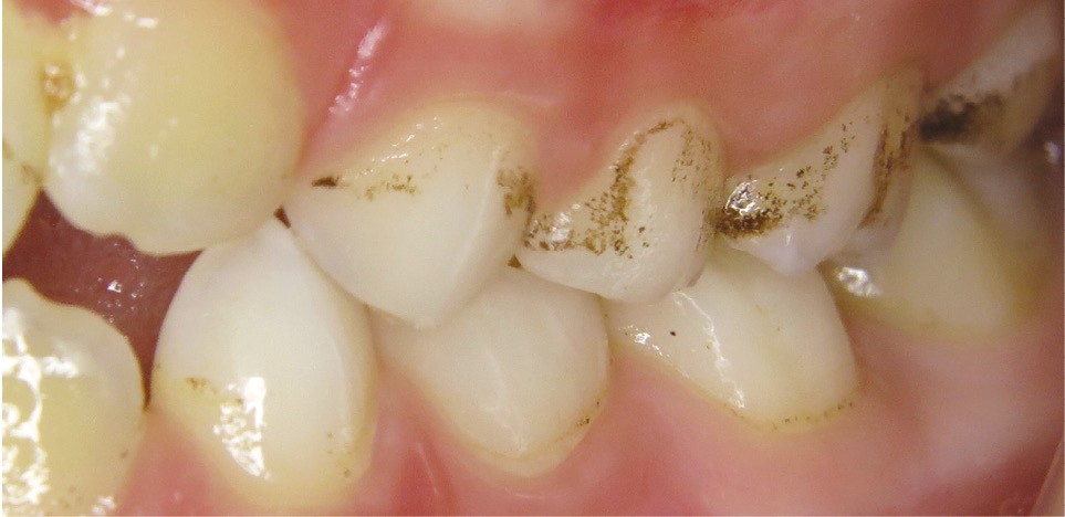 - soit par des dépôts noirs formant une ligne noire (continue ou non) parallèle à la gencive marginale localisée au niveau du tiers cervical de la couronne dentaire sur les faces vestibulaires, palatines/linguales et proximales aussi bien des dents temporaires que définitives ;