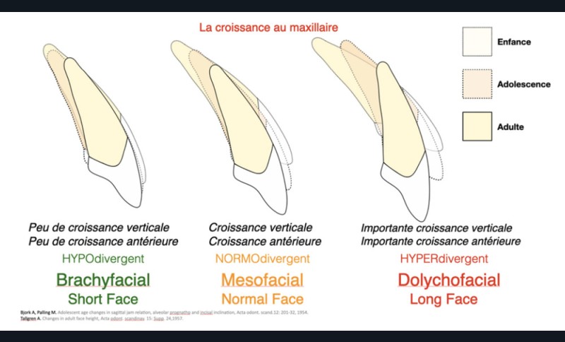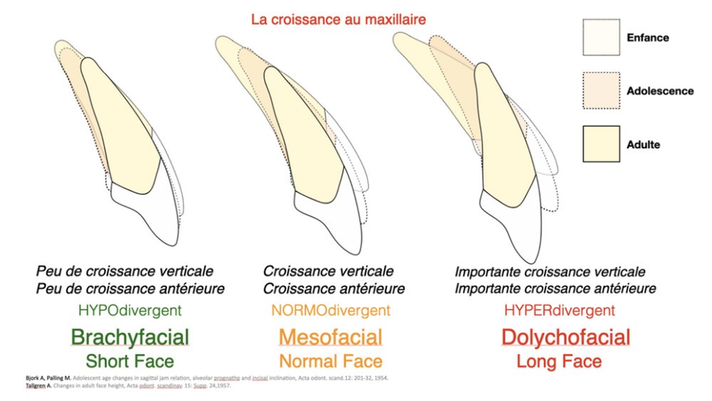 La croissance maxillaire se fait dans les trois directions : transversale par la suture palatine, verticale par la crête alvéolaire, sagittale par déplacement du maxillaire vers le bas et l’avant, puis plutôt verticale à l’adolescence. Les process alvéolaires vont se développer avec l’éruption et la mise en place des dents et ont un rôle de rattrapage entre croissance maxillaire et mandibulaire [5, 6]. On peut classer trois types de croissance au maxillaire [7, 8] (fig. 1).