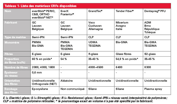 Sur le marché dentaire, il existe de nombreux matériaux CRFs qui se différencient par l’agencement des fibres, le nombre de fibres et les types de fibres, par exemple verres à base de silicates (verre de type E (Electrical Glass), verre de type S (Strength Glass), verre de type R (Resistance-Glass) et fibres de polyéthylène [1] (tableau 1).