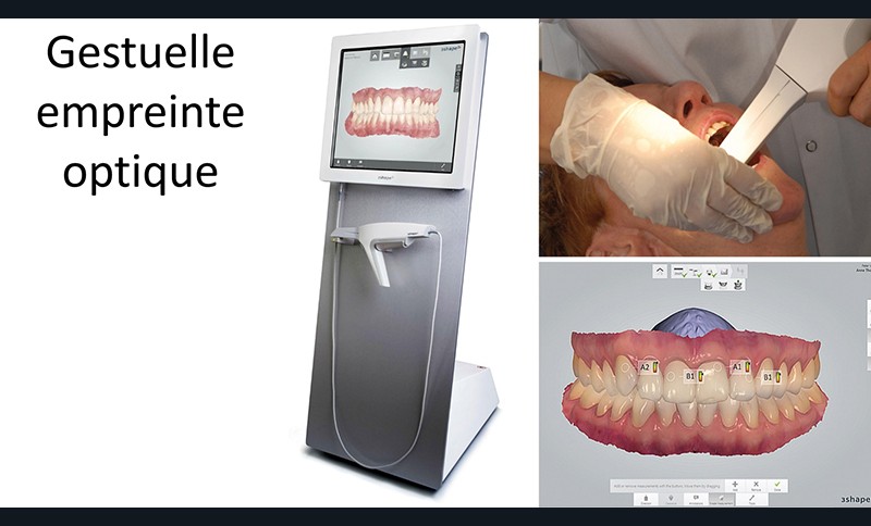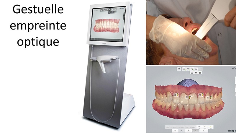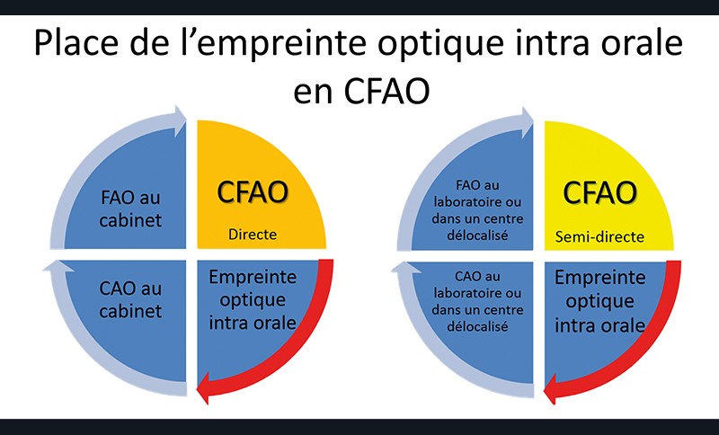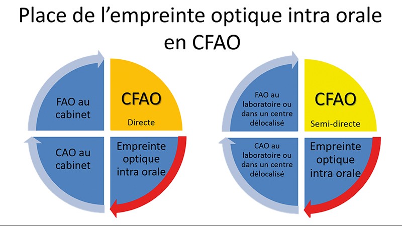 L’empreinte optique intra-orale réalisée à l’aide d’une caméra intervient lors de l’étape d’acquisition en CFAO directe ou CFAO semi-directe (fig. 1). La prise d’empreinte repose sur trois enregistrements distincts : l’arcade concernée, l’arcade antagoniste et un enregistrement vestibulaire en position d’intercuspidie maximale permettant la corrélation des deux arcades (fig. 2).