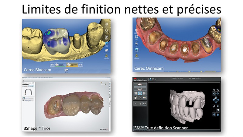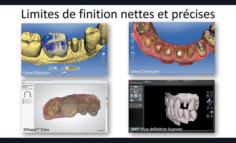 Les tissus durs (dents préparées, dents non préparées) et les tissus mous (parodonte) doivent être enregistrés de la manière la plus fidèle possible (fig. 3). Les préparations sont réalisées en respectant les impératifs spécifiques aux matériaux de restauration. Des limites de finition nettes et précises (fig. 4), la réalisation de prothèses transitoires en CFAO semi-directe sont le garant et le prérequis à la réalisation d’une empreinte optique intra-orale réussie.