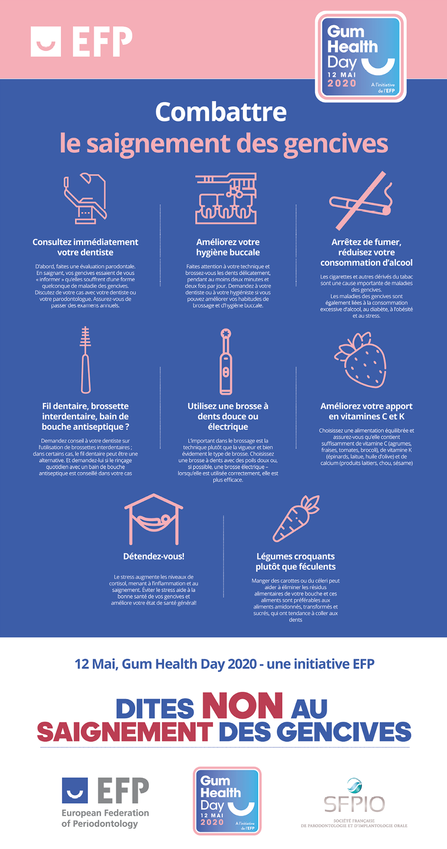 Cette journée a pour objectif de sensibiliser à l’importance de la prise en compte du saignement de la gencive comme un signe de maladie parodontale. Disponible sur le site de la SFPIO, une vidéo YouTube, « la boîte à questions » (www.sfpio.com), réalisée à l’occasion, a mis l’accent sur l’utilisation d’outils numériques en ligne pour promouvoir le message : « Dites non aux saignements des gencives » afin de sensibiliser à la façon dont les saignements de gencive sont un signe de maladie des gencives et d’encourager une bonne hygiène buccale pour aider à prévenir cette maladie.