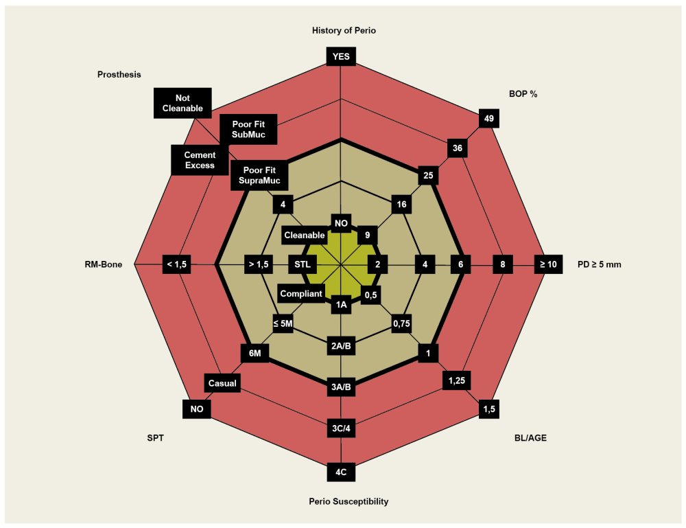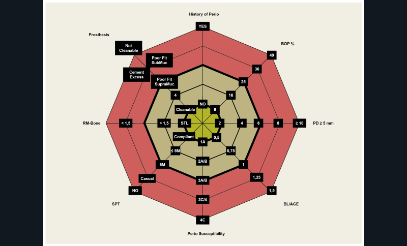 Diagramme d’évaluation des risques construit autour de 8 paramètres documentés pour être associés aux péri-implantites. En libre accès sur http://ircohe.net/IDRA, il est facile à remplir et peut entrer facilement dans une pratique quotidienne.