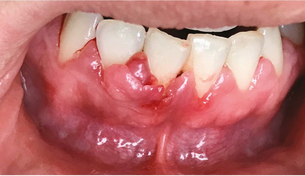 Les modifications hormonales à mettre en relation avec l’hygiène bucco-dentaire, les paramètres socio-économiques, l’âge précoce de la grossesse ainsi que l’augmentation du grignotage pourraient augmenter la prévalence des caries dentaires chez la femme enceinte. Ces patientes sont régulièrement sujettes à des envies multipliant le nombre de prises alimentaires souvent très riches en sucre. Ces apports sucrés, associés à la baisse du pH salivaire lors de la grossesse, entraînent un déséquilibre du cycle déminéralisation et de reminéralisation. Le risque carieux peut être augmenté, ainsi que la susceptibilité à l’érosion dentaire accrue par les vomissements et/ou les reflux gastro-œsophagiens [2]. L’action hormonale peut également avoir des répercussions sur les tissus parodontaux. La gingivite gravidique observée sur plus d’une femme enceinte sur deux, constitue une réponse inflammatoire de la gencive exacerbée par la présence de plaque bactérienne, et favorisée par l’augmentation des taux d’œstrogène et de progestérone [3] (fig. 1). 5 % des futures mères développeront un épulis, dont l’étiologie reste méconnue (fig. 2) [4].