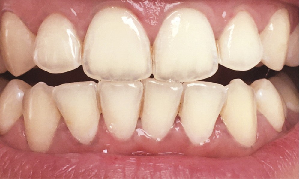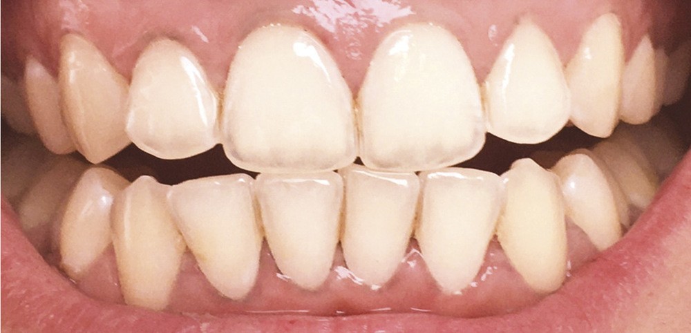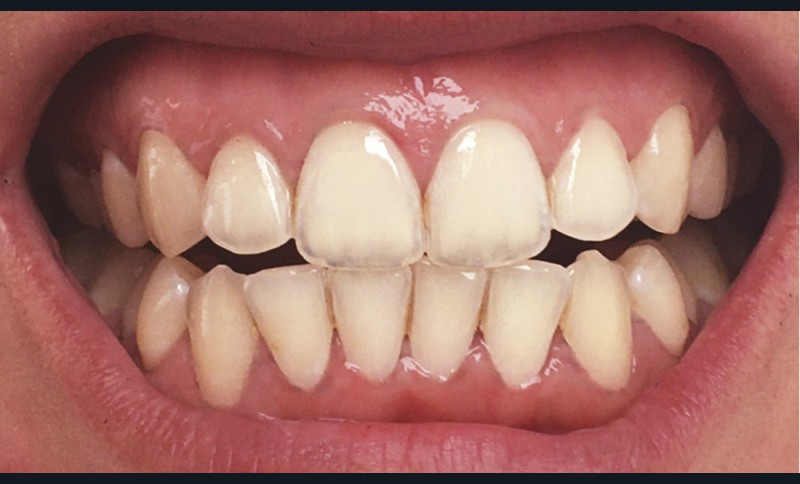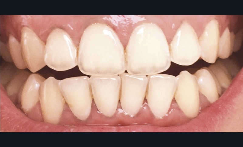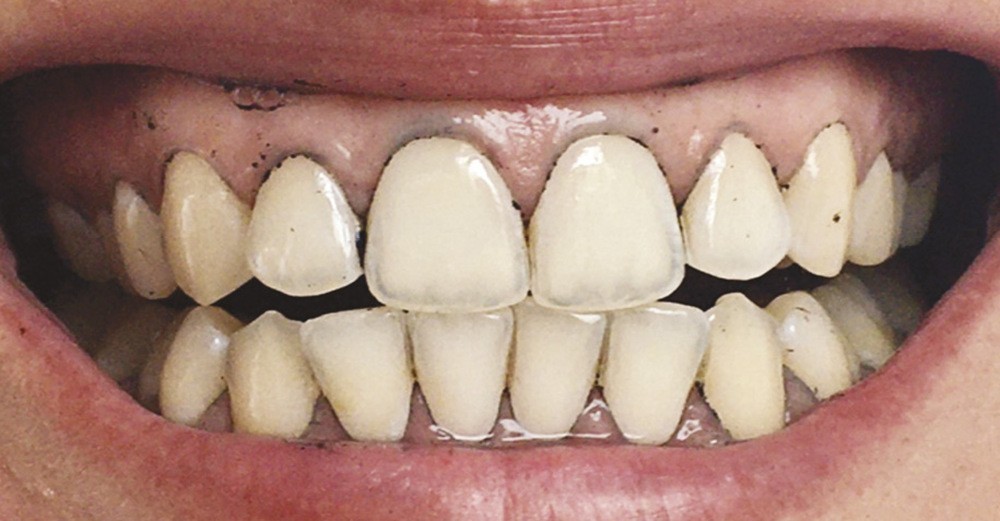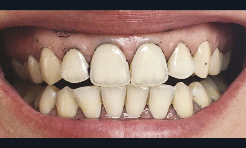 Lors du brossage avec un dentifrice ou une poudre à base de charbon actif, il se crée une mousse gris noire, parfois difficile à éliminer. Des particules noires se déposent, et s’accumulent dans les sillons et anfractuosités des dents, au niveau des zones de jonctions des restaurations et au niveau de la gencive, laissant ainsi un liseré noir inesthétique (fig. 6). Pour supprimer ces colorations, un brossage plus long, plus actif, voire répétitif est souvent nécessaire (fig. 7 et 8).