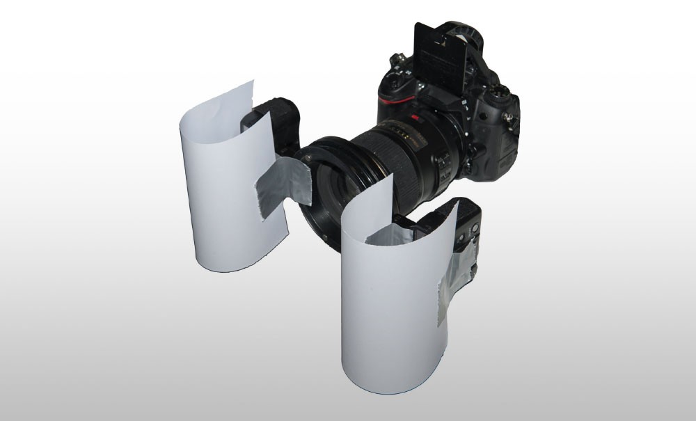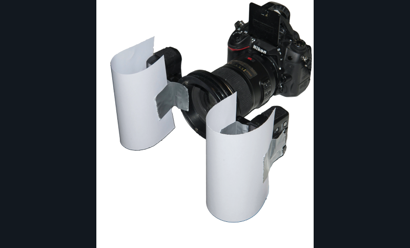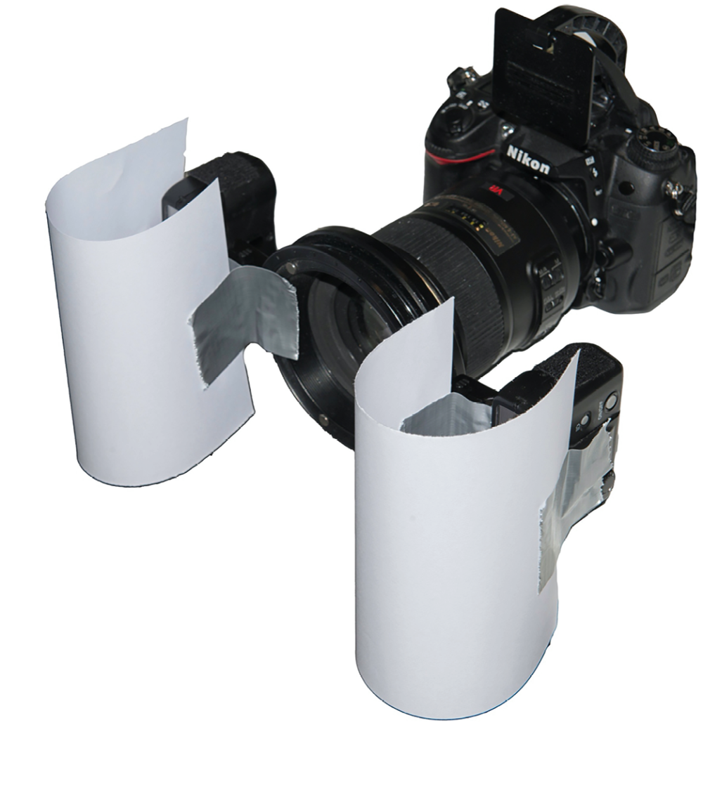 Le matériel de base à utiliser [3] se compose d’un appareil photo reflex, d’un objectif macro et d’un flash. Ce dernier, par sa position et son association avec des accessoires, va permettre de révéler les structures externes à reproduire. Le principe même de l’éclairage au flash est la création d’un contraste entre des zones illuminées, donc visibles, et les zones non illuminées restant dans l’ombre. Une autre notion à intégrer est la taille de l’illuminant : plus il est petit, plus la lumière est « dure » et moins la texture est visible. À l’inverse, l’augmentation de la taille de la source lumineuse entraîne une diffusion de la lumière, plus « douce », et permet de souligner la texture d’une dent. C’est la technique de la boîte à lumière (fig. 1).