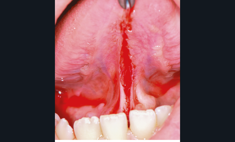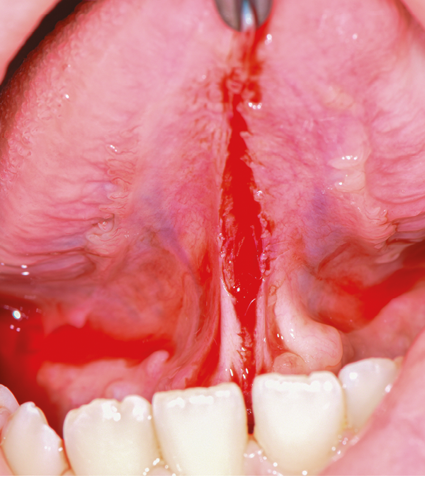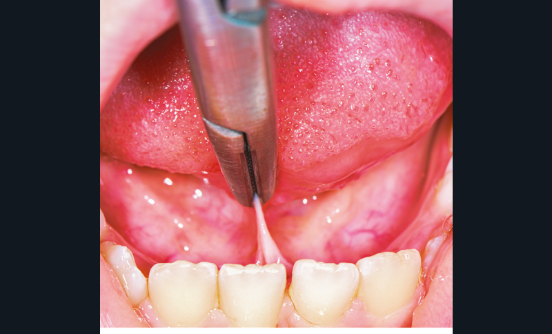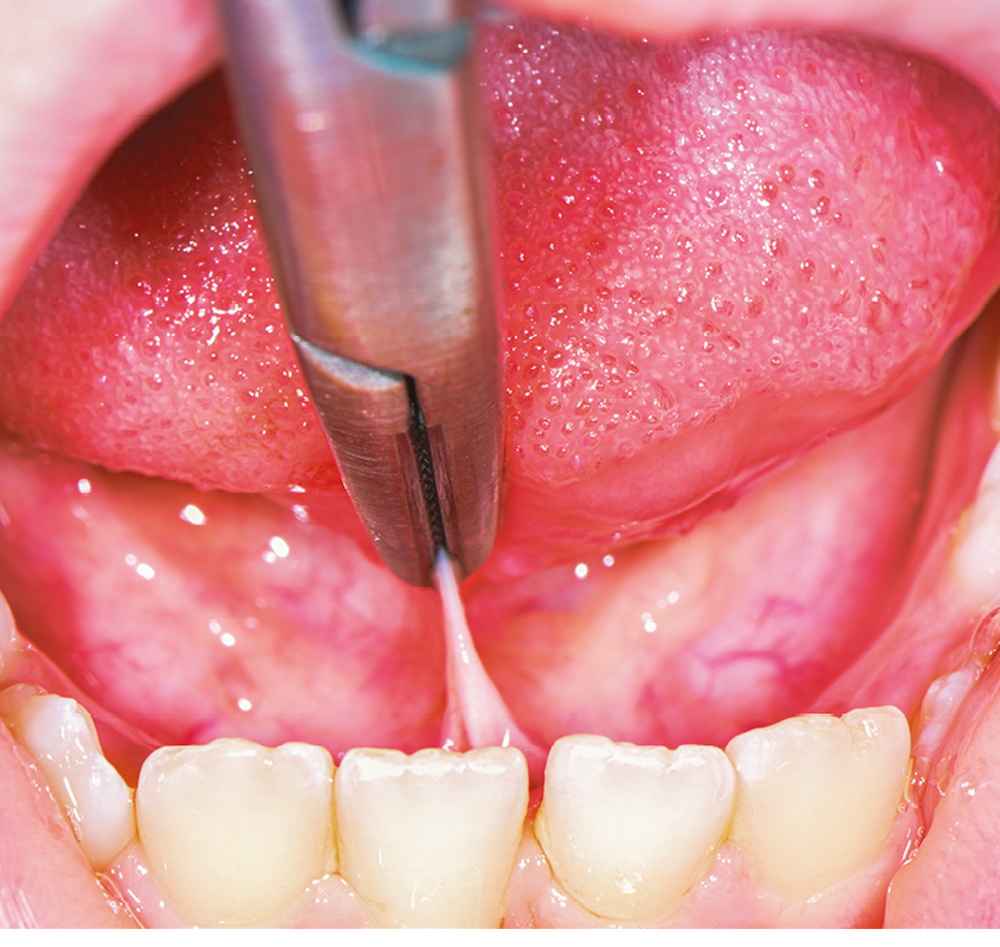 Elle est réalisée lorsqu’il existe une ankyloglossie (anomalie congénitale avec présence d’un frein court).La langue ne peut jouer son rôle de « conformateur buccal » et participer à la morphogenèse du maxillaire supérieur (fig. 4 et 5).