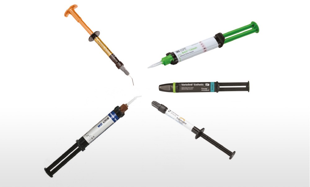 – à matrice organo-minérale (les ciments verres ionomères), couplés ou non à un promoteur d’adhésion (améliorant les valeurs d’adhérence). On peut citer le Fujicem 2 (GC), le Fuji plus (GC) ou le Meron Ac (Voco).