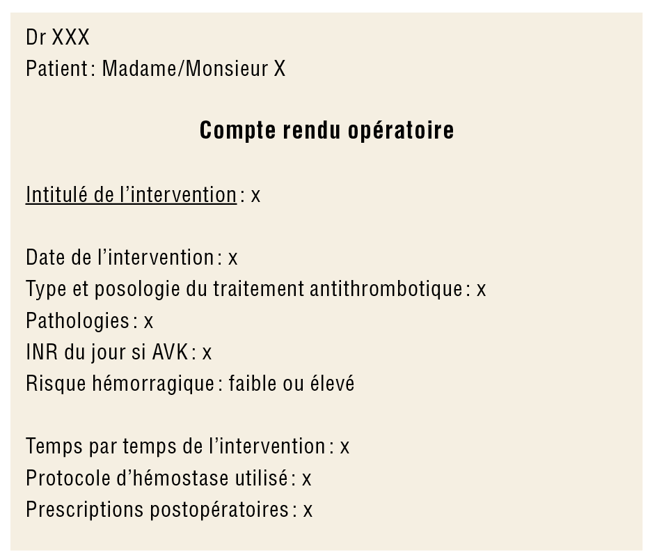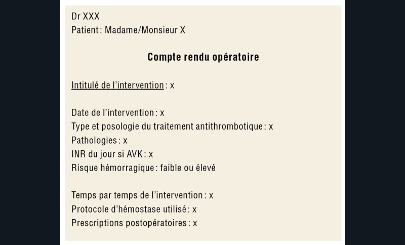 Dans le compte rendu opératoire, qui doit être obligatoire quels que soient le patient et le geste chirurgical, les informations telles que la date de l’intervention, le type et la posologie du traitement antithrombotique, les pathologies connues, la valeur de l’INR lors de la chirurgie (si prise d’AVK), le type d’intervention, la classification du risque hémorragique, le protocole d’hémostase locale utilisé, les prescriptions postopératoires doivent être mentionnées et présentées en cas d’hémorragie postopératoire si le praticien est différent de l’opérateur. Ainsi, la bonne transmission des informations est garantie (fig. 5).