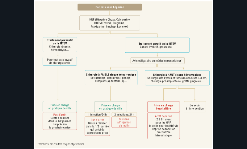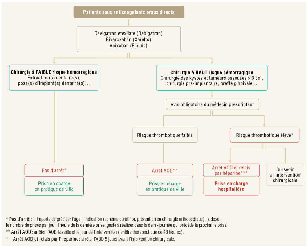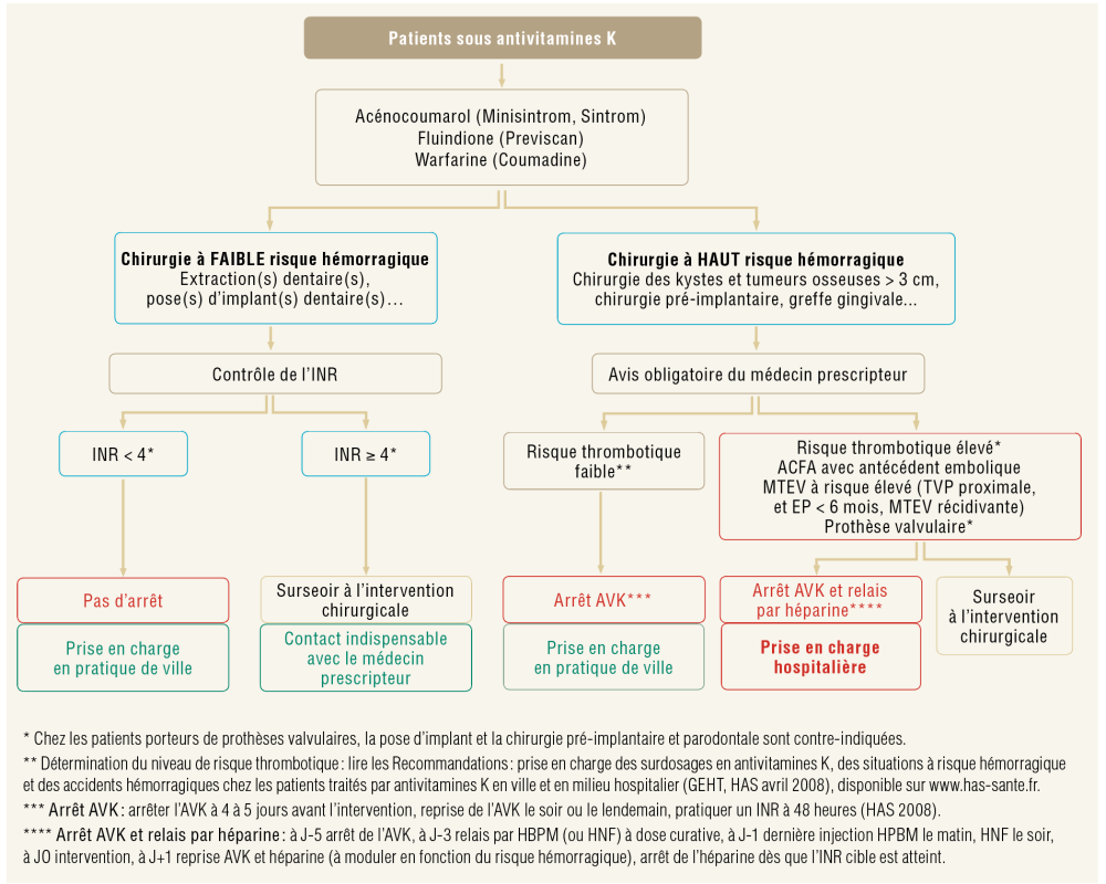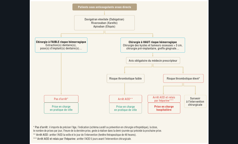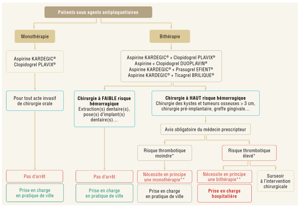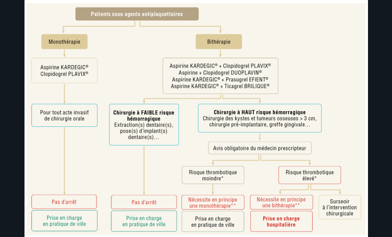 Il est avant tout nécessaire de distinguer les gestes à haut risque hémorragique de ceux à faible risque hémorragique ainsi que la famille d’antithrombiques [4]. Ces traitements antithrombotiques sont largement prescrits, en cardiologie par exemple, et entraînent une augmentation du risque hémorragique chez le patient. Cependant l’interruption du traitement expose à un risque de complications thrombo-emboliques. Une analyse des risques et des bénéfices sur les modalités d’adaptations des traitements en cas de chirurgie endobuccale a conduit à l’élaboration de recommandations permettant une adaptation sécurisée des protocoles. Il a été établi des diagrammes de prise en charge en fonction de la famille d’antithrombotiques et du geste à réaliser.