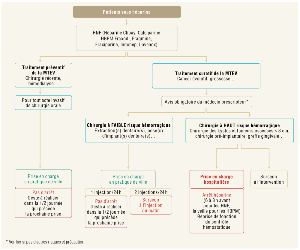 Pour les héparines : elles sont généralement prescrites chez des patients hospitalisés et rarement rencontrées en omnipratique. En cas d’intervention, leur prise en charge est bien spécifiée dans les recommandations (fig. 4).