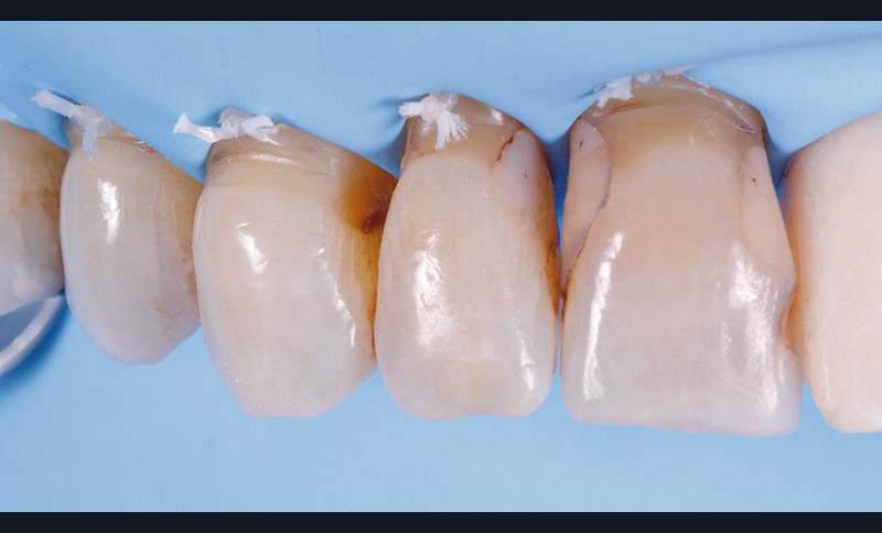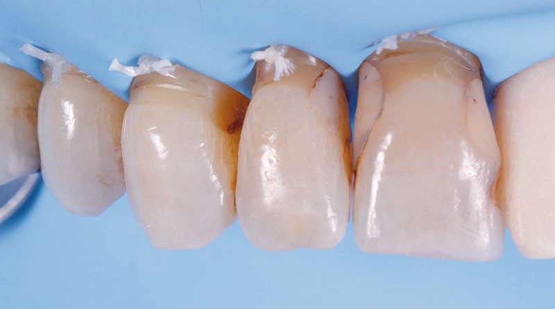 Il est appliqué de préférence au-dessus de la feuille de digue (côté praticien, pas côté patient). Cela permet en particulier de disposer de l’armature du cadre pour accrocher et mettre secondairement en tension des ligatures (fig. 2a et b).