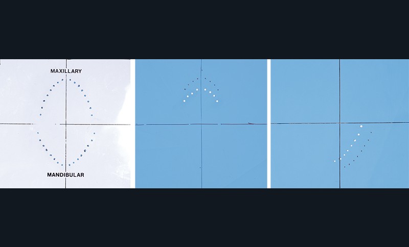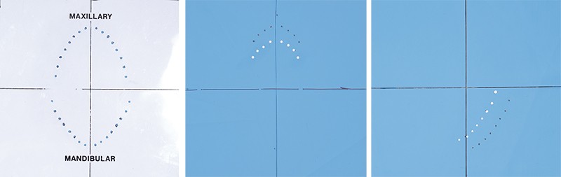 La situation générale des perforations peut, par défaut, s’appuyer sur celle donnée par le gabarit fourni par le fabricant (chablon). Cependant, il convient d’adapter systématiquement cette situation standard à la forme de l’arcade et à la position réelle des racines des dents à isoler. Afin que la feuille de digue soit la plus stable possible et assure au mieux son rôle de rétraction des tissus mous périphériques (langues, lèvres, joues), en recouvrant dans tous les cas la bouche ouverte du patient, une recommandation de base est que les perforations ne soient jamais situées, pour l’arcade concernée, au-delà de la ligne horizontale virtuelle médiane. Classiquement, en regardant la feuille de digue de face, les perforations destinées aux dents des cadrans I et IV sont situées à gauche de la ligne sagittale médiane et les dents des cadrans II et III, du côté droit. Mais il peut parfois se révéler judicieux de recentrer les perforations dans le sens horizontal ou vertical selon le quadrant à isoler (fig. 1).