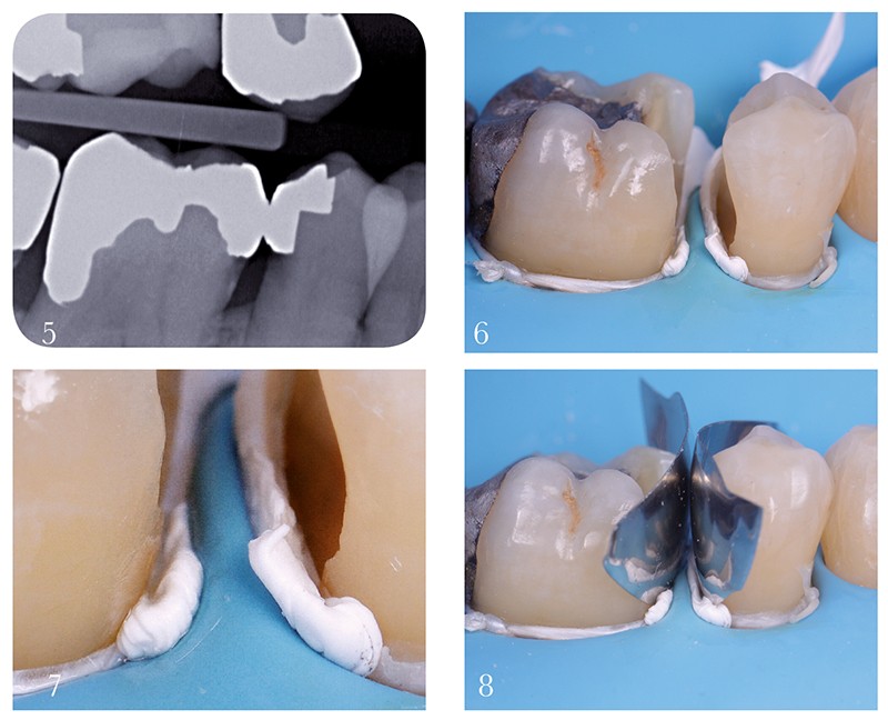 7. Mais quel système de matrice choisir ? Il paraît assez clair qu’un profil proximal convexe et une zone de contact ferme ne peuvent être obtenus qu’au moyen de matrices sectorielles. Mais ces systèmes sectoriels sont plus délicats à utiliser que les matrices circulaires. À l’aide d’une spatule de bouche, un espace est alors aménagé entre le téflon…
