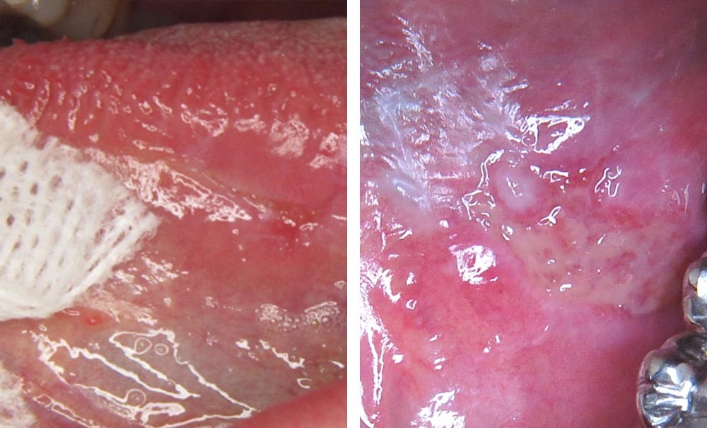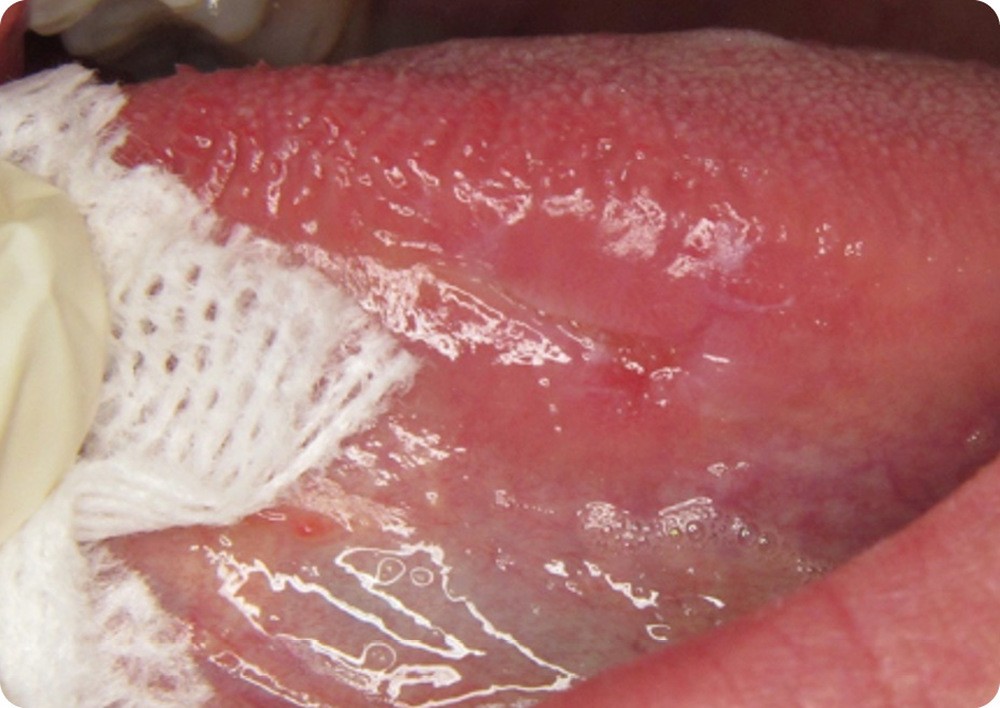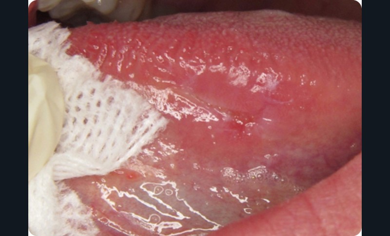 - La patiente présentait une douleur modérée au niveau de la face ventrale gauche de la langue depuis un mois. Elle avait appliqué un gel d’acide hyaluronique prescrit par son dentiste, sans effet sur les symptômes. Elle a fini par consulter son médecin généraliste qui l’a adressée en consultation.