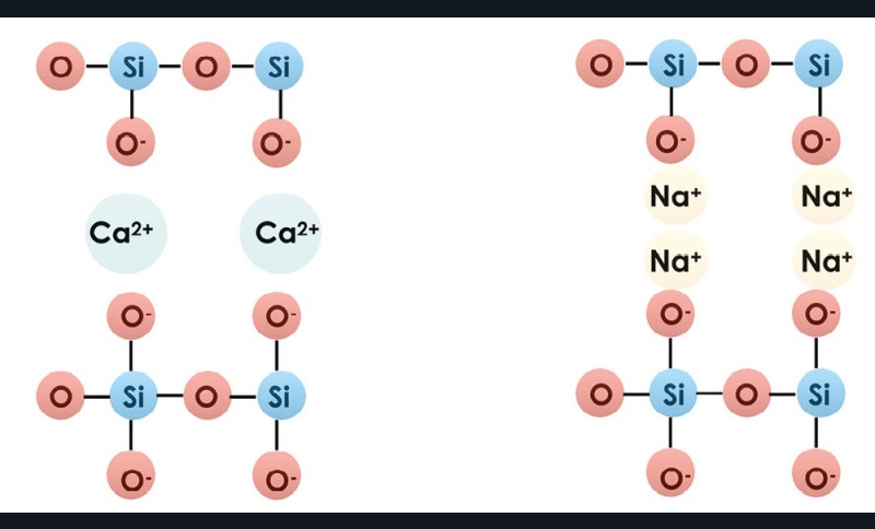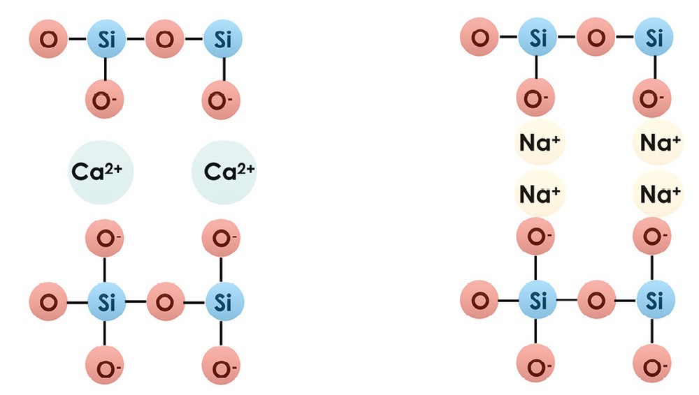 Un verre minéral se définit comme un solide amorphe constitué d’un réseau non organisé d’oxydes et présentant un phénomène de transition vitreuse. On distingue les oxydes formateurs du réseau (SiO2, P2O5) formant des polyèdres liés entre eux et les oxydes modificateurs du réseau (CaO, Na2O) conférant des propriétés particulières aux verres. Les modificateurs du réseau transforment les oxygènes pontant en oxygènes non pontants, diminuant ainsi la connectivité des chaînes de polyèdres et augmentant la réactivité des verres (fig. 1).