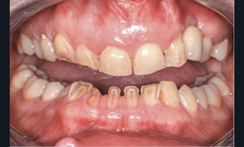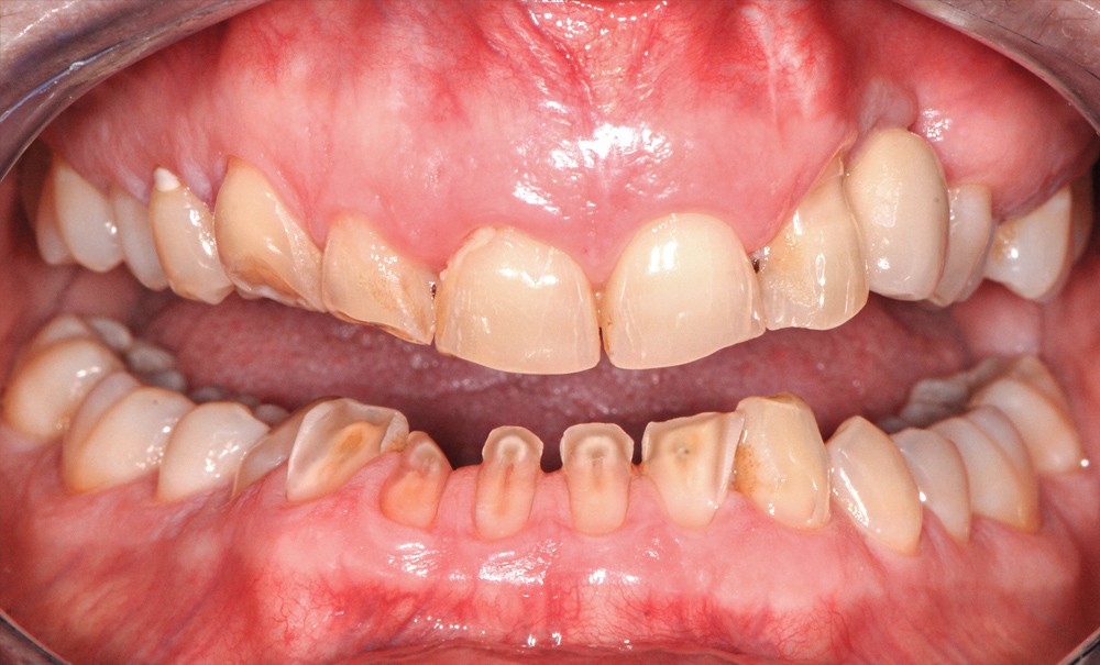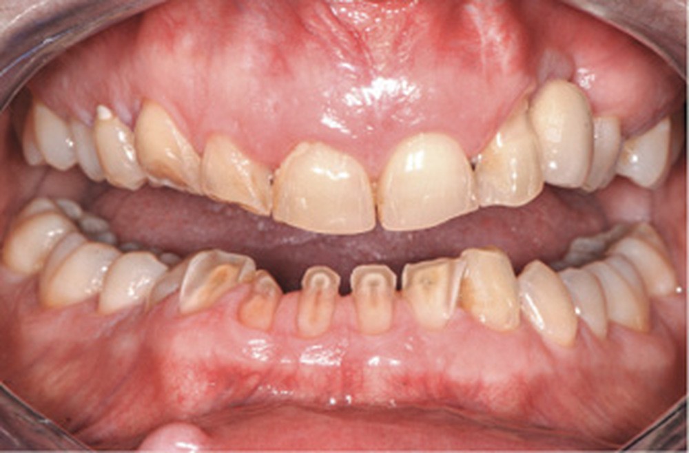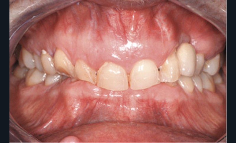 Patiente de 76 ans venue consulter en raison de son inquiétude relative à l’usure de ses dents antérieures mandibulaires très sensibles au froid et générant des difficultés de mastication. La patiente était également désireuse d’améliorer son sourire disgracieux (fig. 1). Pour autant, elle ne souhaitait pas bénéficier d’une restauration d’importance et invasive et refusait catégoriquement toute proposition d’éventuelle orthodontie.