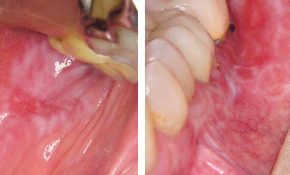 Il révélait la présence de brûlures buccales, aggravées par l’alimentation, mais négligées compte tenu du contexte général. Plus récemment, les brûlures s’étaient aggravées, ce qui a motivé la consultation de chirurgie orale pour avis spécialisé.