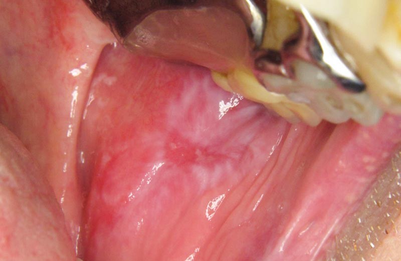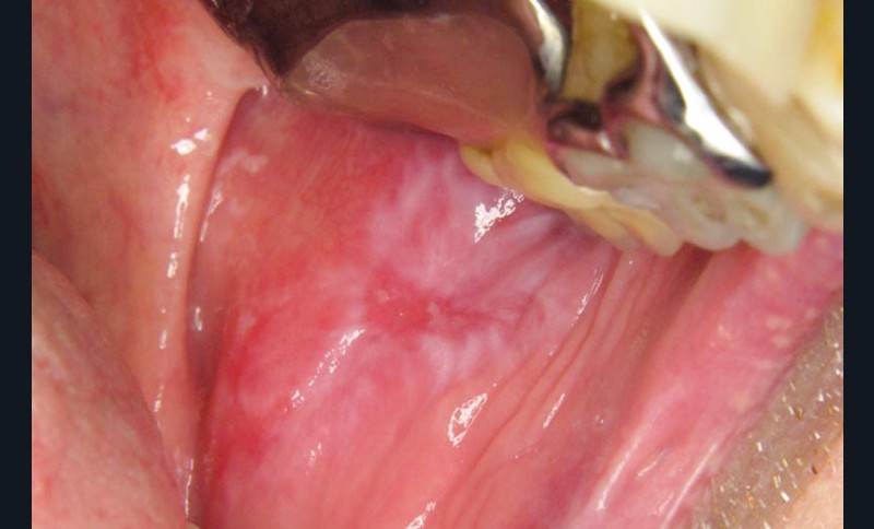 Patient adressé par son médecin interniste pour avis et prise en charge d’une lésion jugale douloureuse, présente depuis 6 mois.
