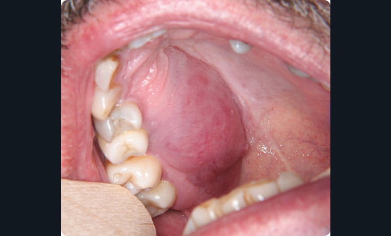 - On observait une tuméfaction oblongue, étendue sur l’hémi-maxillaire droit de 13 à 17, côté palatin. à la palpation, la lésion était rénitente.