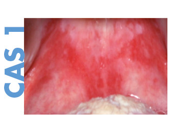 Il révélait des lésions érythémateuses et érosives de la partie postérieure du palais, débordant sur le palais mou. Les lésions étaient bilatérales. Les amygdales palatines étaient épargnées.