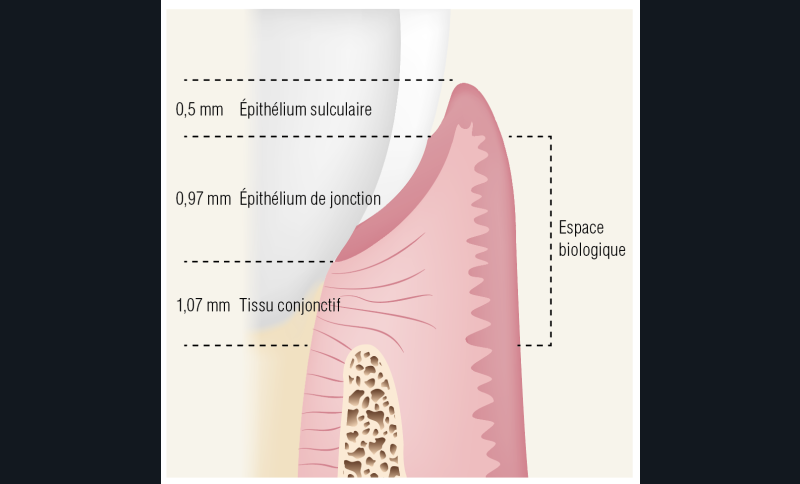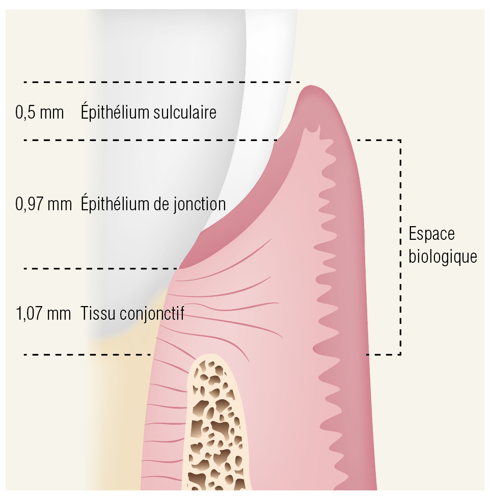 Bien qu’il existe des variables inter et intra-individuelles sur ces valeurs [3], un minimum de 3 mm (voire 4 mm ou plus) sera à respecter entre la marge cervicale de la restauration et l’os alvéolaire, permettant le maintien de la hauteur de l’attache supra crestale de 2 mm et une profondeur de sulcus de 1 mm [4,5].
