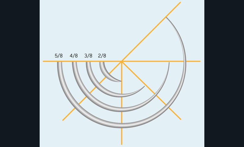Il existe deux types de section en odontologie : la section ronde, qui est la moins traumatisante mais dont la préhension est délicate, et la section triangulaire inversée, plus rigide, plus facile à maintenir dans les mors de la pince mais un peu plus traumatisante. La courbure de l’aiguille (fig. 2) est exprimée en huitième de cercle : plus le plan à suturer est profond, plus la courbure de l’aiguille doit être importante. En odontologie, on utilisera une aiguille 4/8e de cercle pour les plans profonds, et 3/8e de cercle pour les plans superficiels.