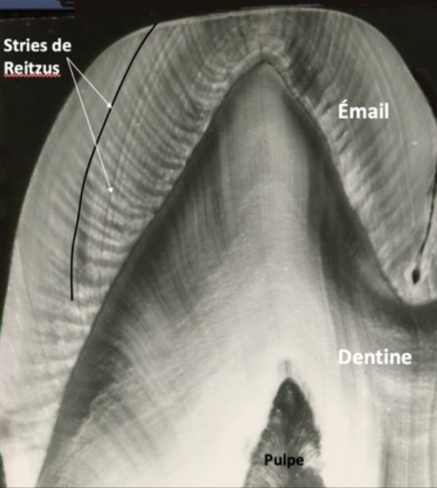 Ce sont des lignes apparaissant sur des coupes d’émail usées et polies, et qui traversent obliquement l’épaisseur de l’émail de la jonction amélo-dentinaire jusqu’à la surface (fig. 2). Au niveau du bord libre ou des cuspides, elles forment des arceaux. Elles correspondent à un phénomène cyclique de sécrétion par les cellules améloblastiques lié à un rythme de huit jours. Elles sont séparées de 25 à 30 µm, sont moins minéralisées que le reste de l’émail et jouent un rôle dans sa résilience vis-à-vis des forces mécaniques de la cavité buccale.