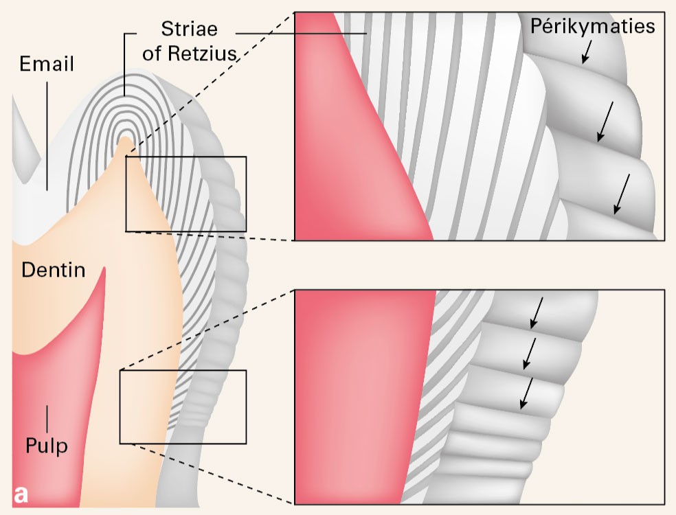 À la surface de l’émail, les stries de Retzius forment les « périkymaties » : séries de sillons parallèles au collet de la dent, espacés d’environ 60 à 120 µm et correspondant aux lignes formées par les stries à la surface de l’émail.