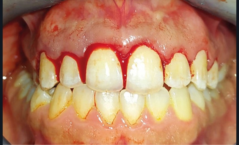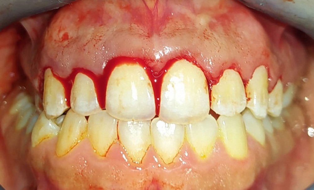 Une jeune patiente de 24 ans, en bon état de santé générale, se présente au service de parodontologie pour une correction du sourire gingival. L’examen clinique extra-buccal met en évidence un sourire gingival avec exposition de toute la gencive, et une hyperlaxité des lèvres. L’examen clinique intra-buccal révèle des dents antérieures carrées d’apparence courte et une bande de gencive kératinisée supérieure à 2 mm (fig. 1). Le sondage osseux montre que la jonction amélo-cémentaire se situe à 2 mm du rebord osseux, confirmé par une radiographie rétro-alvéolaire. Le diagnostic d’éruption passive incomplète est posé.
