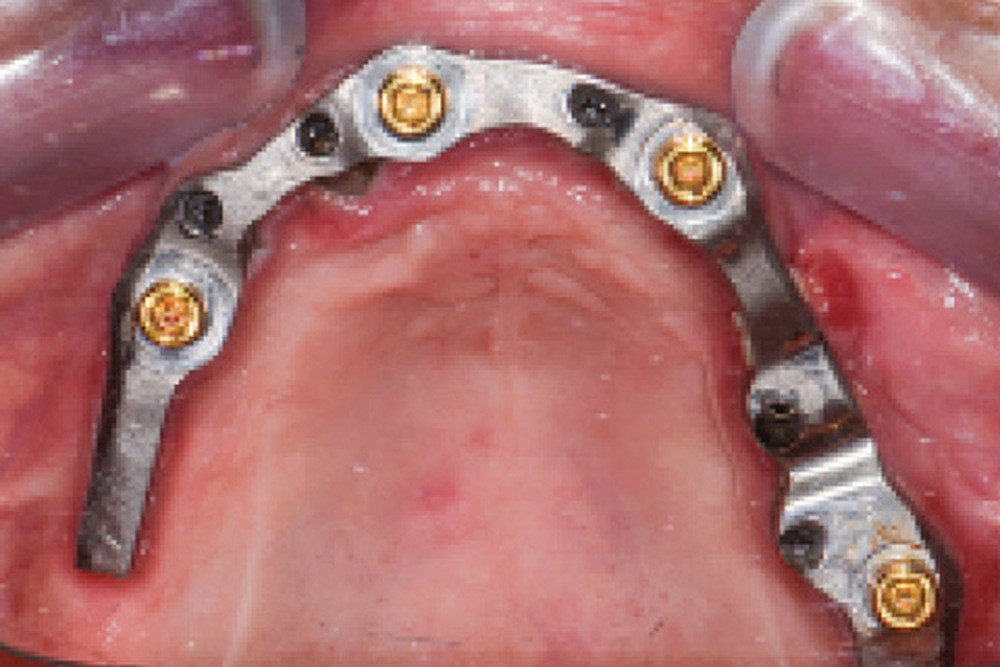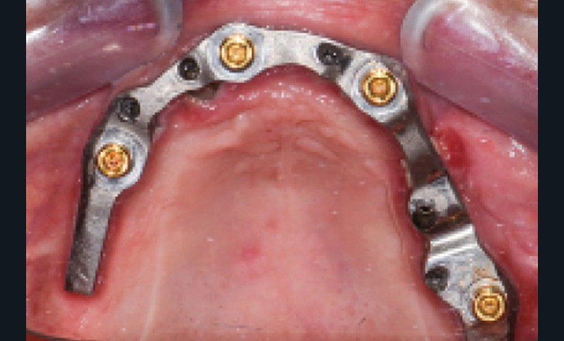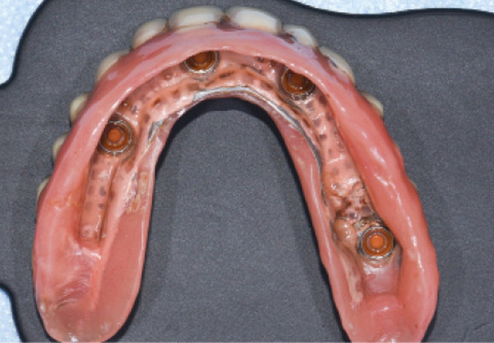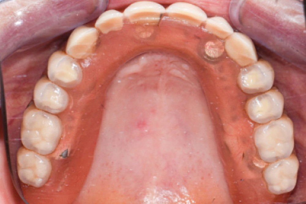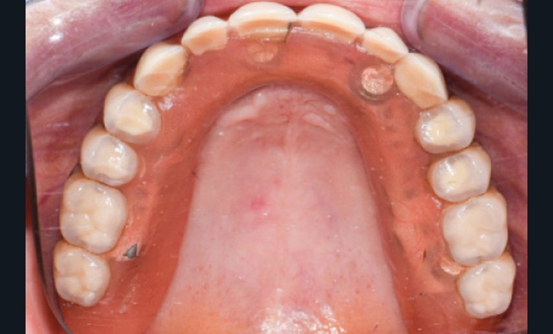 En 2019, di Francesco et al. [5] ont réalisé une revue systématique et méta-analyse concernant le nombre d’implants requis au maxillaire pour réaliser une prothèse amovible complète supra-implantaire (PACSI). D’après cette étude, il existe un lien fort entre le taux de survie implantaire et le nombre d’implants utilisés : un minimum de 4 implants semble ainsi être préconisé [6]. Enfin, la mise en place (ou l’intégration) d’une infrastructure métallique dans l’intrados doit être systématique car elle permet, d’une part, d’éviter les fractures, et, d’autre part, d’assurer une meilleure rétention et répartition des forces [7, 8].