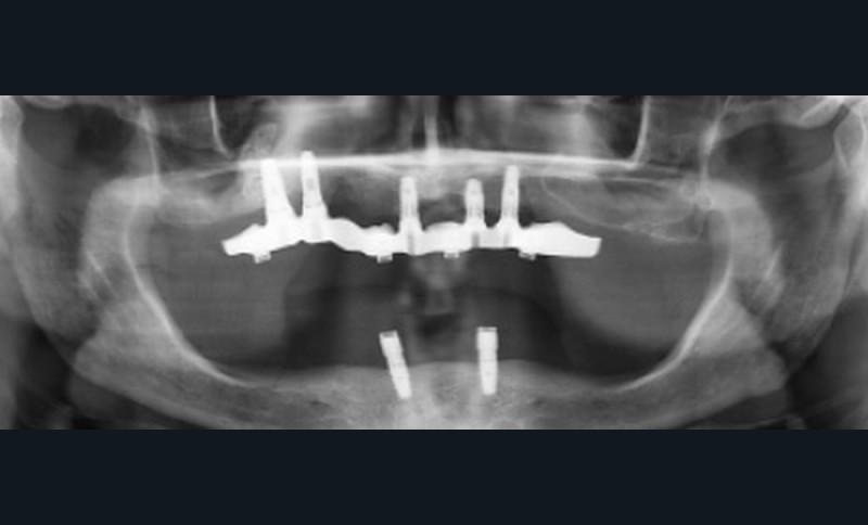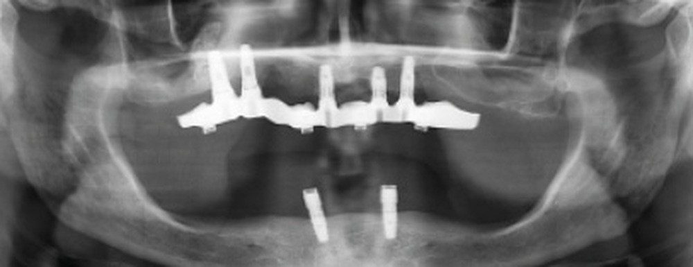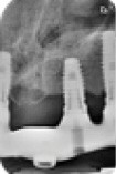 Une réhabilitation par PACSI maxillaire a été réalisée dix ans auparavant sur 5 implants en place de 13, 12, 21 et sur 24 et 26 (fig. 2a et b). Dans le cadre du plan de traitement initial, 6 implants avaient été indiqués. L’un d’entre eux, en position distale dans le secteur I, n’a jamais été ostéointégré. La patiente ne souhaitant plus de chirurgie, il avait donc été décidé de réaliser une prothèse sur 5 implants. La barre est directement connectée aux implants. À la mandibule, la patiente présente également une PACSI sur 2 implants associés à 2 piliers Locator®.