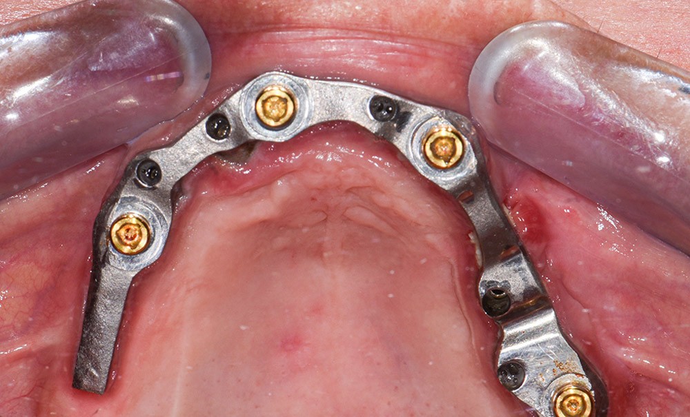 Lors de l’examen clinique, après dépose de la prothèse et dévissage de la barre, le constat est alarmant : présence de plaque abondante…