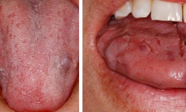 Histoire de la maladie. Il y a douze ans, la patiente a développé des lésions multiples : 2 sur la langue, 2 sur la lèvre inférieure et 1 sur la muqueuse vulvaire. Les lésions étaient asymptomatiques et elles n’avaient pas eu tendance à augmenter de taille.