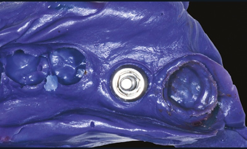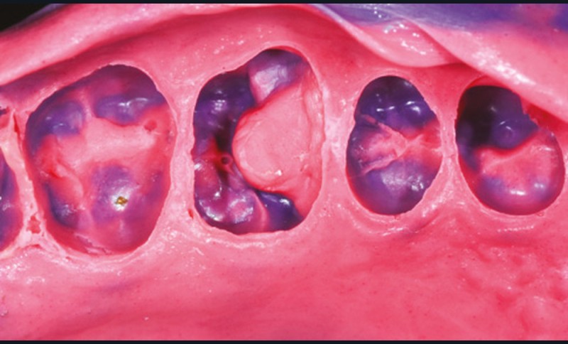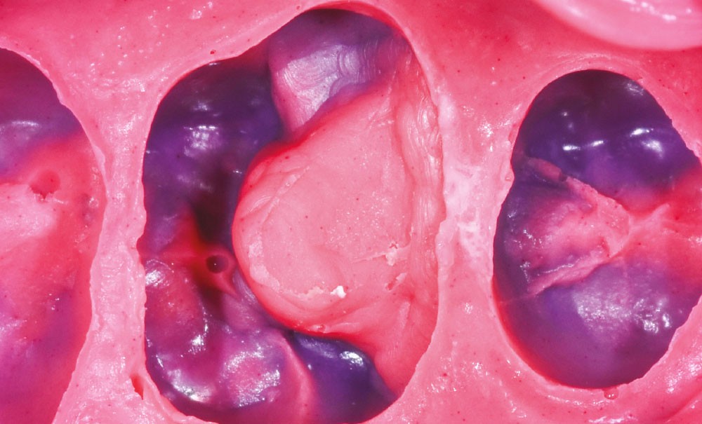 Il est également possible de réaliser des empreintes double mélange (Fig. 2) en utilisant alors la basse et la haute viscosité de la marque. L’un des intérêts de cette technique réside dans le contraste colorimétrique apporté qui permet de faciliter la lecture des limites.