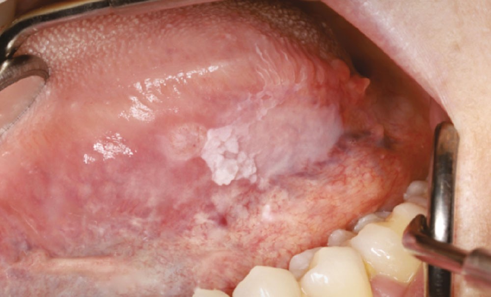 Motif de la consultation. Patiente de 31 ans venue consulter après la découverte, lors de soins d’hygiène bucco-dentaire, d’une lésion kératosique sur la face ventrale gauche de la langue.