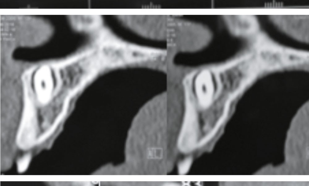 La radiographie rétro-alvéolaire confirme la communication de l’obturation avec la chambre pulpaire de la 11 et de la 21, matures, ainsi que la découverte fortuite d’un élément surnuméraire ayant une…