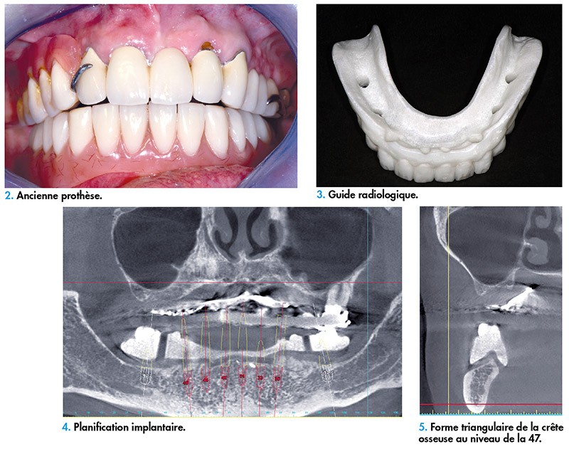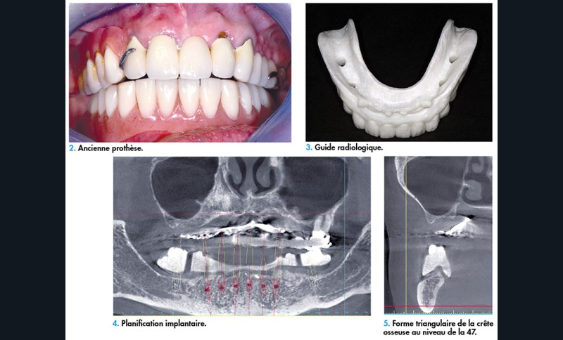 Avant d’envisager la planification implantaire, il est impératif de valider le projet le projet prothétique qui va notamment devoir répondre aux souhaits esthétiques de la patiente. Dans ce cas, l’ancienne prothèse n’étant pas conforme à ses doléances (fig. 2), il est nécessaire de réaliser un nouvel appareil mandibulaire correspondant à ses attentes.