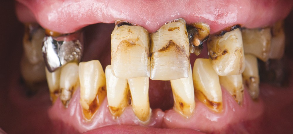 Le patient de 45 ans, sans antécédents médicaux, fume vingt cigarettes par jour depuis quinze ans. Conscient de son état bucco-dentaire, il consulte pour retrouver une solution fixe, globale et esthétique. Il insiste sur le faire de se concentrer dans un premier temps sur l’arcade maxillaire ; l’arcade mandibulaire fera donc l’objet d’un traitement différé.