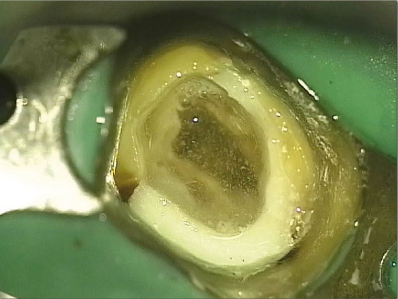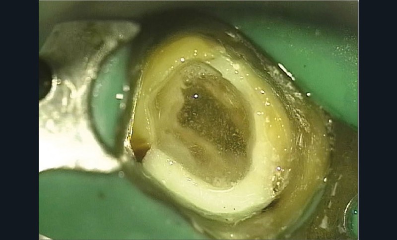 La meilleure façon de respecter l’asepsie est sans aucun doute la pose de la digue (1), associée, en cas de perte de parois consécutive à la pathologie carieuse ou à la dépose d’anciens matériaux, à la réalisation d’une reconstitution préendodontique (fig. 1) (sujet traité dans l’article « Gestion de l’urgence et prétraitement »). Ces deux étapes se réaliseront si possible avant effraction pulpaire ou à défaut en protégeant les entrées canalaires.