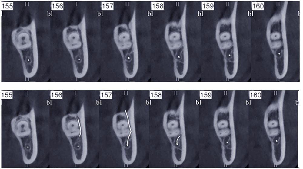 – tomodensitométrie ou scanner d’abord, puis à présent tomographie volumique à faisceau conique ou cone beam CBCT [6, 7] – permet l’approche radiologique bi- et tridimensionnelle mettant en évidence des variantes anatomiques du nerf alvéolaire inférieur (NAI), parfois non décelables en incidence panoramique.