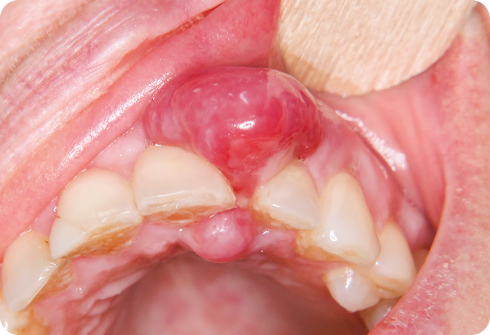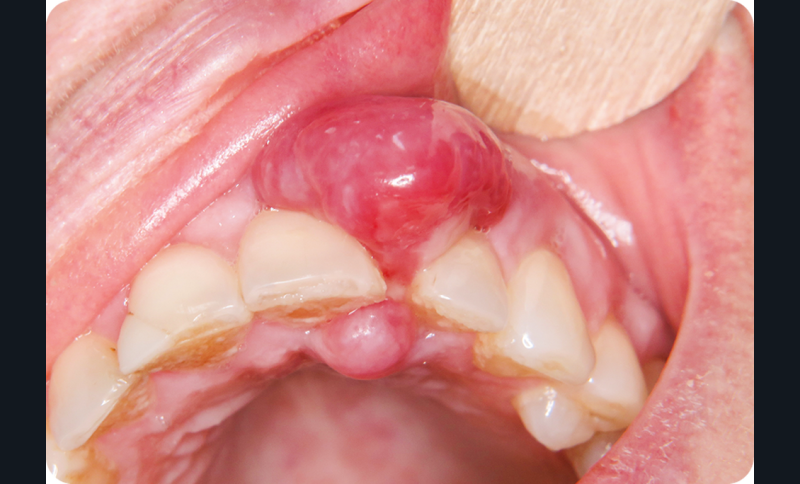 Patiente suivie par un parodontiste qui a réalisé un surfaçage gingival. À la fin des soins est survenu un nodule gingival déformant la lèvre supérieure.