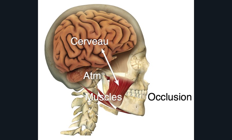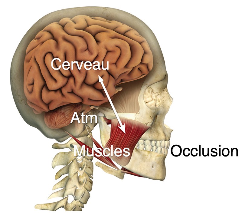 Cependant, les arcades dentaires ne sont que l’un des composants d’un système complexe comprenant également deux articulations temporomandibulaires (ATM), une gauche et une droite et l’ensemble des muscles de la mastication (fig. 2). Ces éléments anatomiques sont dépendants les uns des autres, il faut retenir que c’est la façon dont les dents s’engrènent qui détermine la position de la mâchoire contre le crâne. Un bon positionnement des ATM permet un fonctionnement harmonieux des muscles.