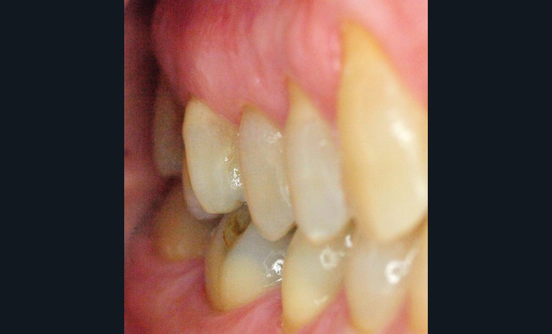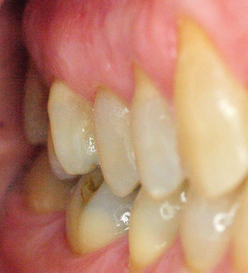 Ce jour-là, aucun diagnostic précis n’est posé concernant cette perception douloureuse. Aussi, nous proposons à la patiente de réévaluer cette sensibilité en fonction de son évolution, et au plus tard sous six mois. Lors de cette consultation de réévaluation, la patiente se présente avec la même doléance, majorée de quelques signes : la douleur, toujours furtive, est plus régulièrement présente, augmentée en puissance (nous n’avons malheureusement pas noté d’échelle d’évaluation douloureuse comparative), mais également déclenchée par la pression dento-dentaire (sans présence d’aliment). En complément, la patiente confirme que cette douleur est plus importante lors de la dépression, du relâché de l’occlusion que lors de la pression [2]. Comme six mois auparavant, la patiente présente un bon état de santé général, n’a ni rhume ni sinusite. L’anamnèse est donc complétée et, grâce à un protocole rigoureux [3], elle nous permet de découvrir aussi des céphalées, des douleurs musculaires et cervicales récurrentes malgré l’intervention d’un ostéopathe. En poussant plus loin l’échange, la patiente déclare une très importante période de stress depuis neuf mois, et nous mettons en évidence une attitude de contacts…